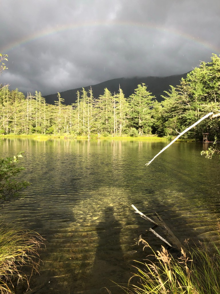 明神池で急にミストシャワーみたいなお天気雨が数分だけ降って、見上げたら虹が出ていた🌈😲✨